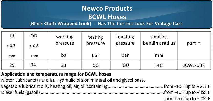 Application and temperature range for BCWL hoses: Motor Lubricants (HD oils), Hydraulic oils on mineral oil and glycol base. Vegetable lubricant oils, heating oil, air, oil containing: from -40°F up to +257°F Diesel fuels (gas oil): from -40°F up to + 158°F, short term up to +284°F