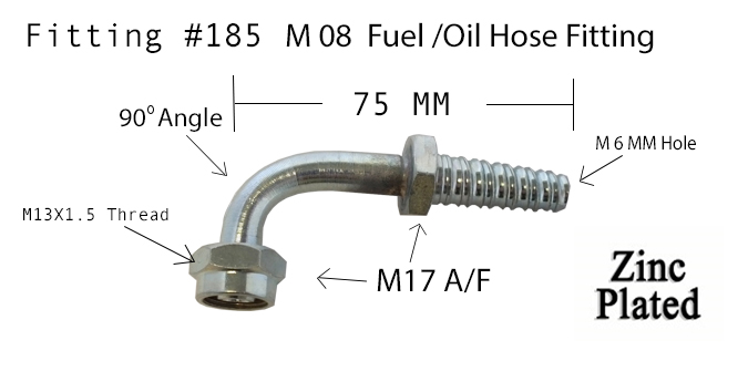 #131 Salva Fitting - M08Zinc PlatedFor M8 Fuel Hose - FER Hose Straight FitWrench Size: 17 A/F Swivel Nut13x1.0 Thread6.08mm Hole49mm LongSpecific..